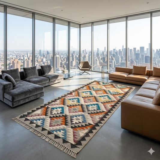 A tribal rug featuring the Ghundum Kirmi pattern—wheat-edge geometry and artisan heritage in a versatile...