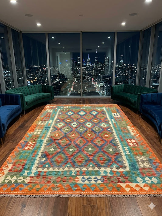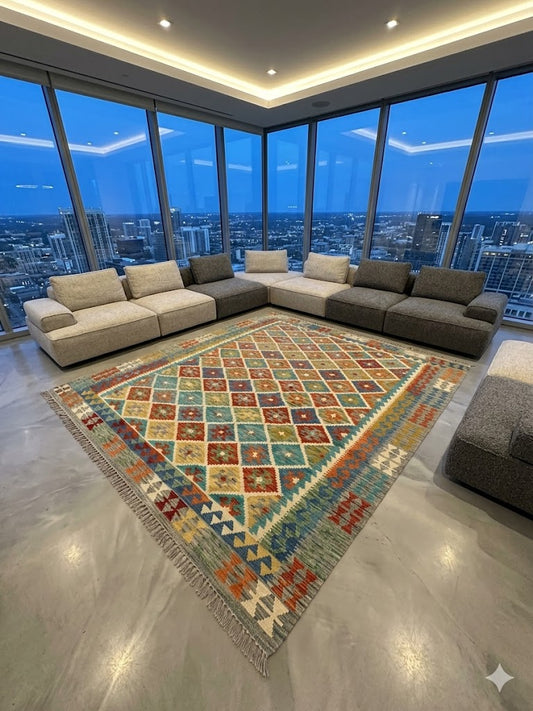 A kilim rug that brings tribal geometry and flatweave heritage into versatile spaces—reversible construction and...