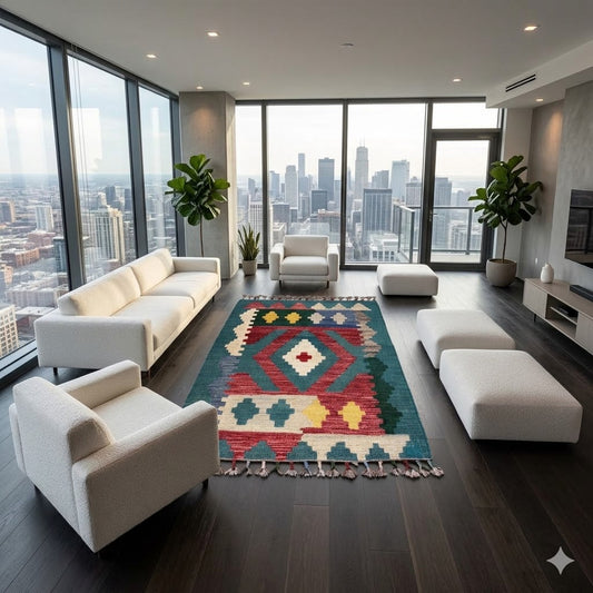 A compact kilim rug that brings tribal geometry and flatweave heritage into intimate spaces—reversible construction...