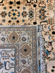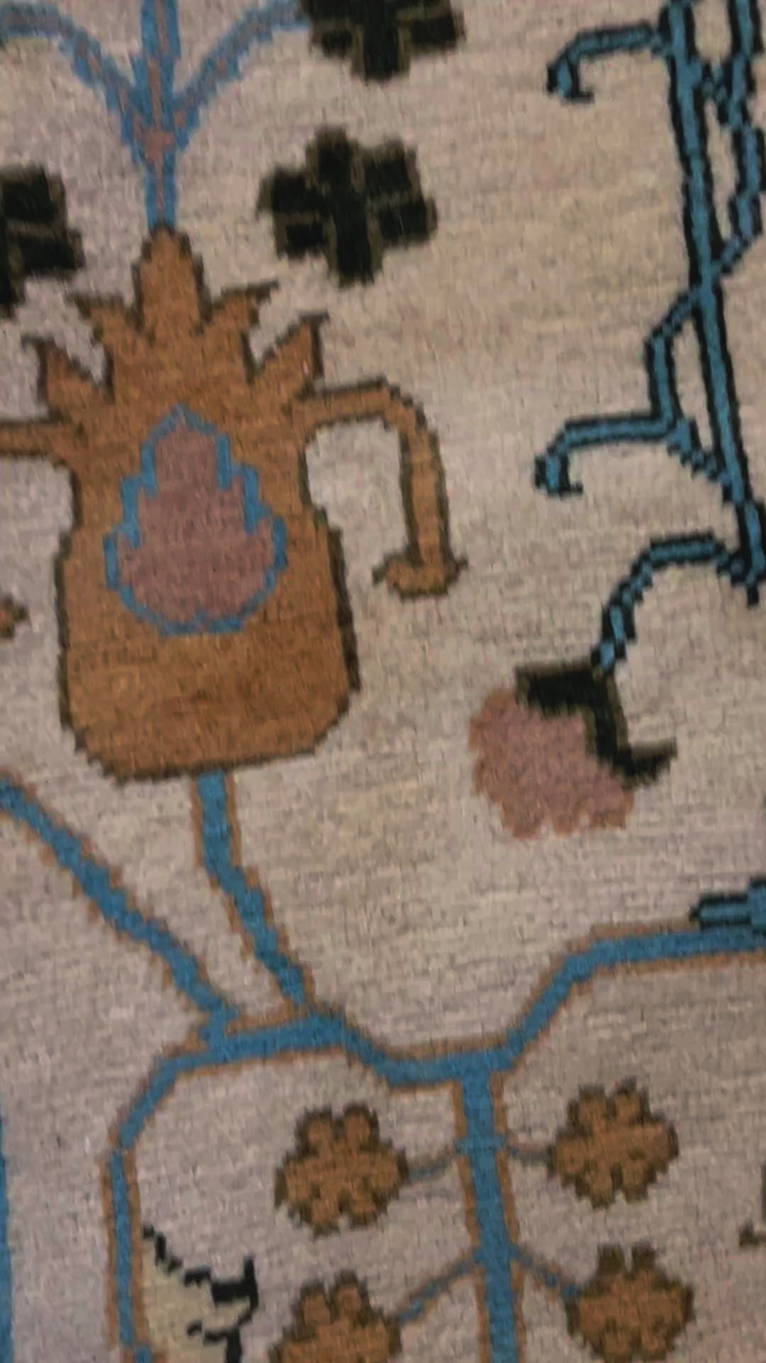 Traditional geometric motifs create visual rhythm across the field while maintaining compositional balance. The generous 6'1" × 9'1" scale (approximately 55 square feet) makes this piece ideal for anchoring living rooms, dining areas, or bedrooms. Works beautifully with gallery-like interiors—plaster walls, natural wood, and minimal furnishings—where the rug can command attention as a centerpiece.