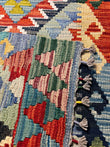 Hand-woven by Afghan artisans using traditional flatweave techniques, this 2'1" × 2'5" piece reflects the disciplined geometry and vibrant palette characteristic of Central Asian kilim-making. The flatweave construction—created by tightly interlocking warp and weft threads—requires exceptional technical skill and pattern memory. Woven on a traditional loom with careful attention to motif clarity and color distribution, the reversible design extends longevity and versatility.
